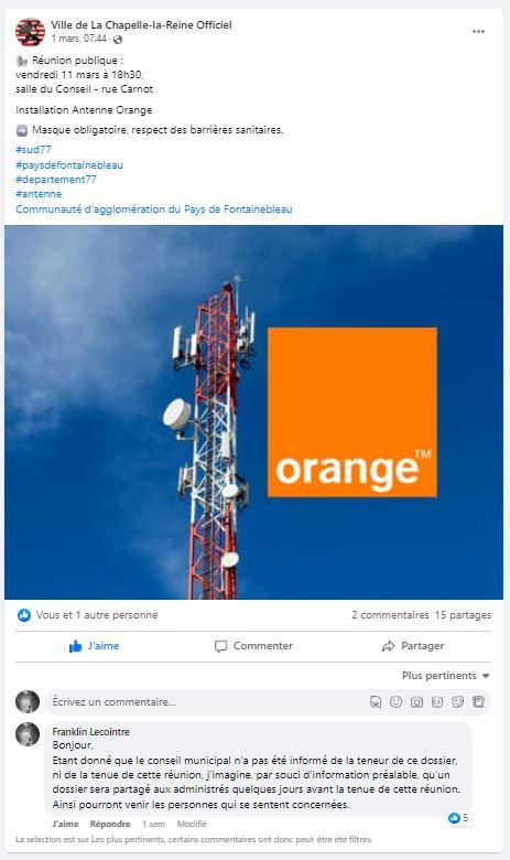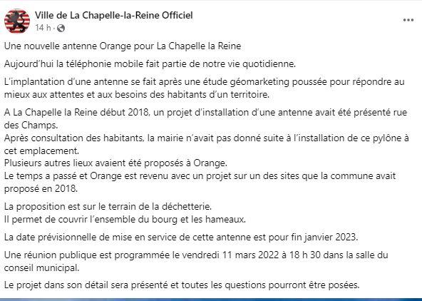 Le projet est abandonné, ou mis en sommeil. Toujours est-il que nous n’avions pas de nouvelles jusqu’au 1er Mars 2022 quand, sans information préalable des élus, nous apprenons par une publication Facebook et une information PanneauPocket la tenue d’une réunion publique au sujet de l’implantation de cette antenne.