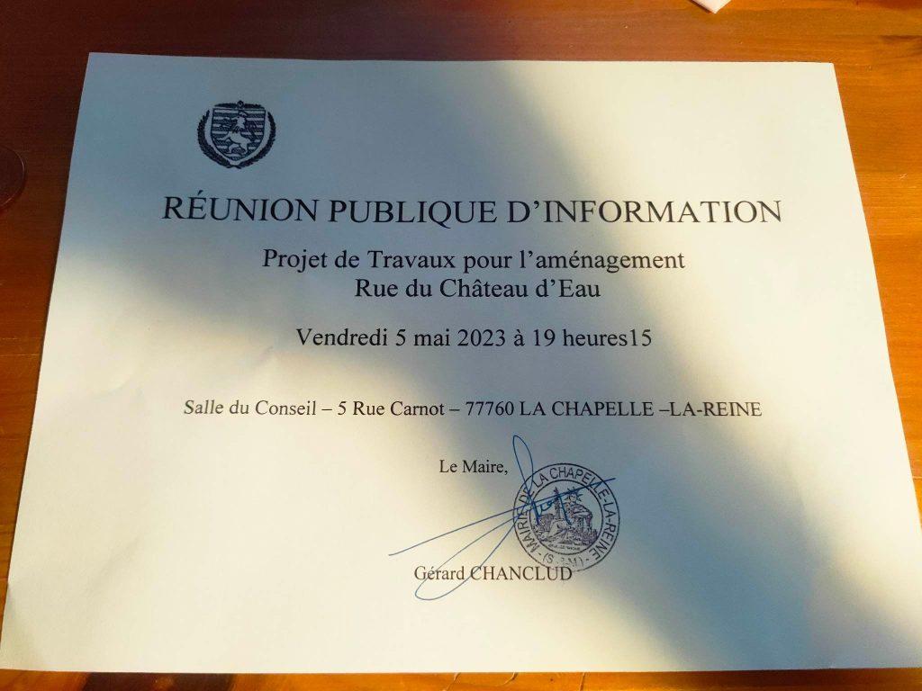 Savez vous que ce vendredi 5 mai 2023, à 19h15 aura lieu une réunion publique, 5 rue Carnot, dans la salle du conseil. L’objet de cette réunion est le projet de travaux pour l’aménagement de la rue du Château d’Eau. A croire que cela ne concerne que les habitants de la rue car le conseil municipal n’en a pas été informé, en tout cas l’opposition, pas de post sur Facebook, ni PanneauPocket et encore moins sur le site de la commune ou sur les panneaux publics.